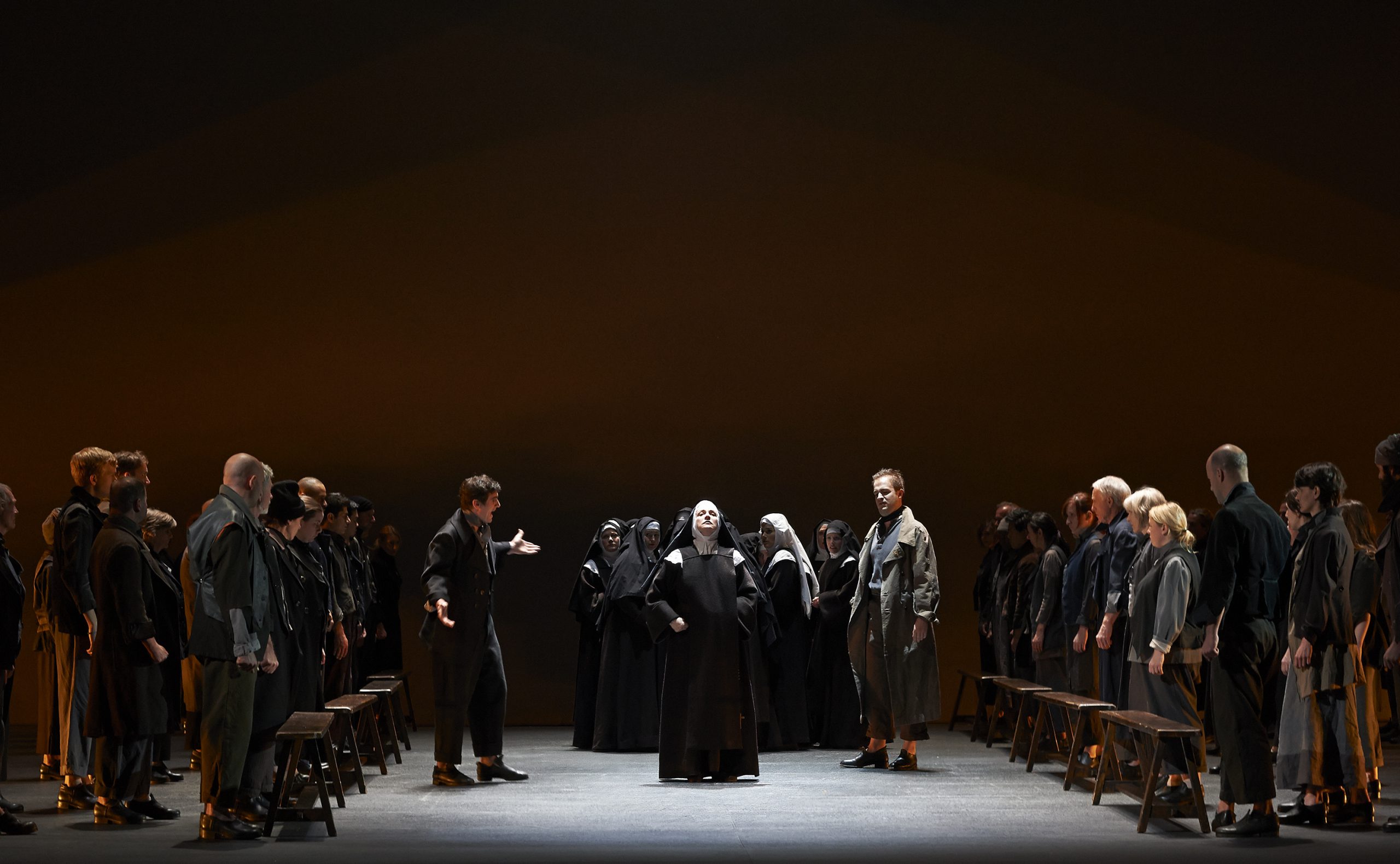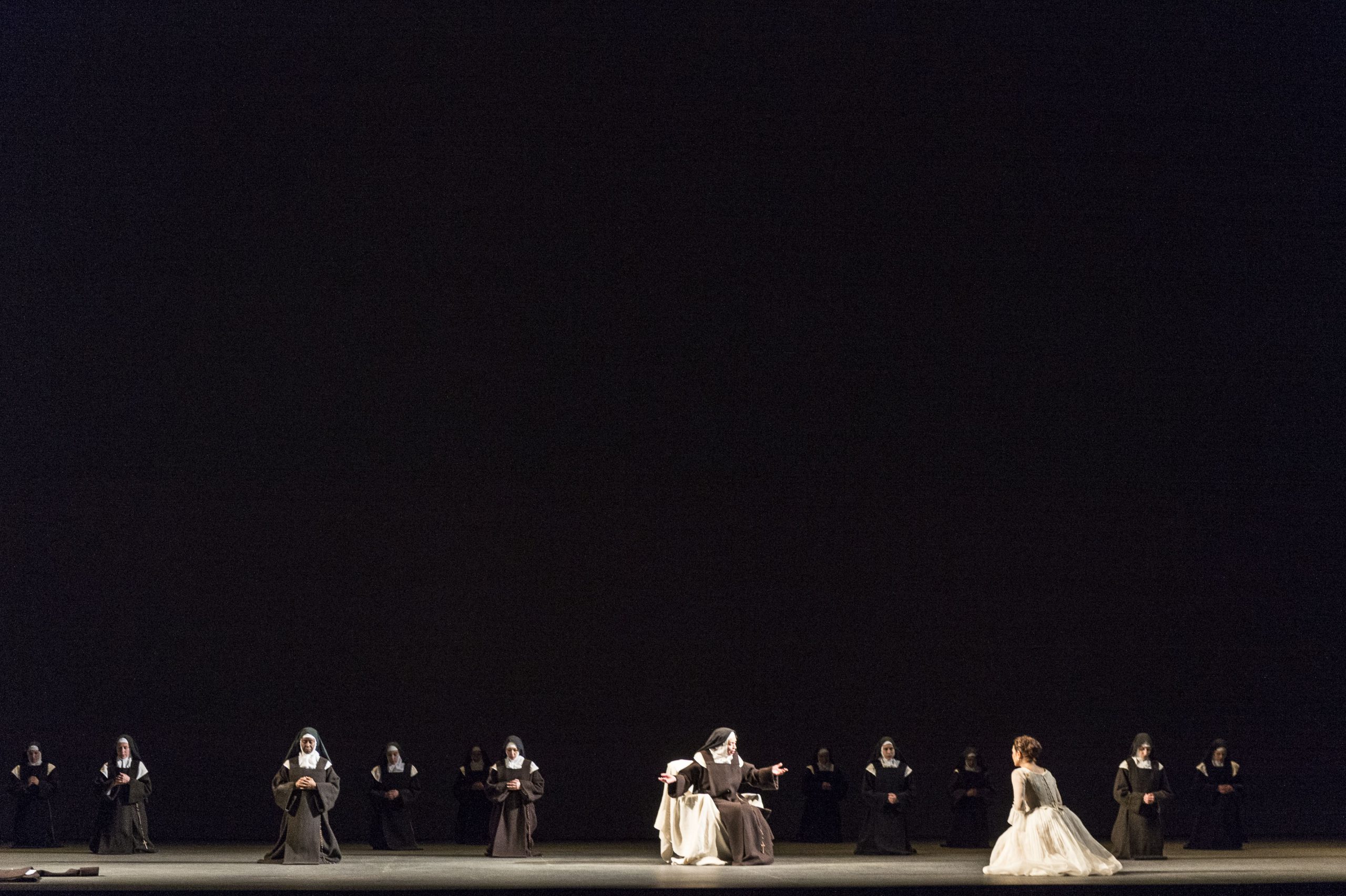 Poulenc’s opera is multi-layered. More than a little relevant political subtext underpins his adapted scenario. In director Robert Carsen’s COC production, a 105-member mob acts as an anonymous vengeance machine sweeping up hapless protagonists, engulfing them, crushing all hope of escape, then sweeping them off stage again back into the darkness. As a physical expression of tyranny, Carsen’s gang of street thugs could not be more palpable. But the director is well aware that Dialogues des Carmélites, however compelling its metaphors — and many have been detected — is much more than a study in mass psychology. And much bigger than simply a tragic tale about an innocent band of murdered nuns.