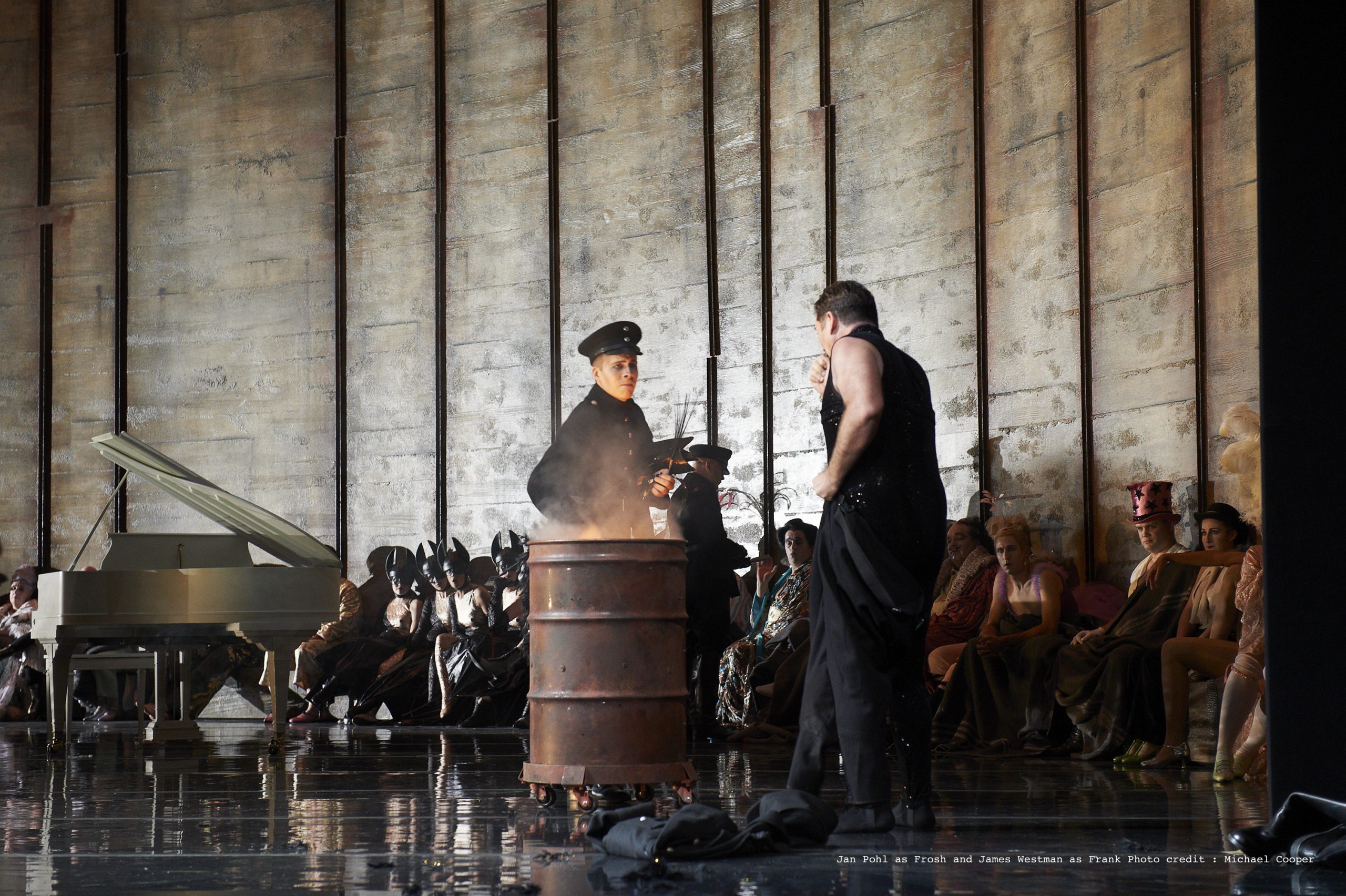 The psychology of Die Fledermaus comes under equal scrutiny on director Alden’s watch. Granted, the need to drink and carouse has always seemed positively compulsive in Strauss’s original characters. Naughty behaviour in general is utterly irresistible to them. Doubtless much of the obsessive merry-making is a reflection of Strauss’s age. In 1874, a stock market crash threw the Austrian economy into melt-down. Audiences were in no mood for more doom and gloom. Understandable and familiar in a twenty-first century context, but in this new Die Fledermaus, a Freudian pov trumps the historical. Dr. Falke becomes the literal cigar-smoking embodiment of the great Viennese pyscho-theorist. Id is everywhere. And libido. And the subconscious. Even hypnotism which fascinated the father of analysis. Eisenstein’s timepiece is a tool for mesmerization. With a snap of his fingers, Falke awakens Rosalinde from a romantic reverie. If only all of Alden’s conceits were as effective. Act II, the ball scene, is oddly unanimated despite cues to the contrary in libretto and score. Still, credit due. Alden’s vision is fascinating.