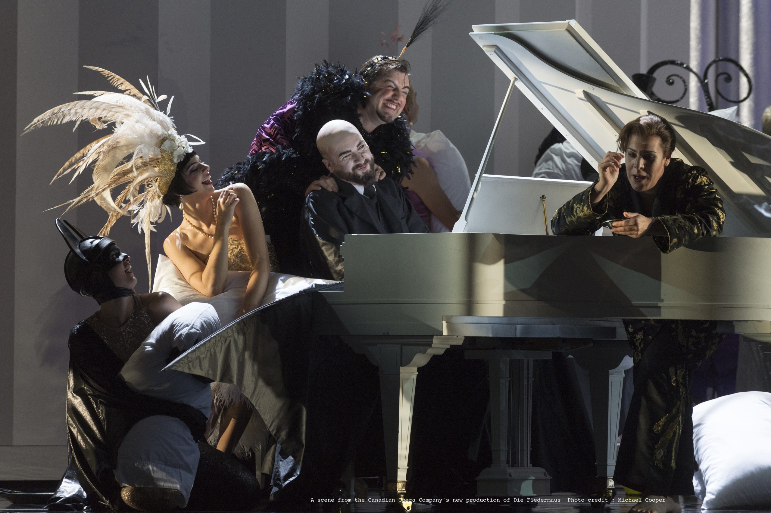 If music drives this Fledermaus, costume is its flashy set of wheels. Designer Constance Hoffman has drawn much of her inspiration from the classic films of Ernst Lubitsch. Bedecked in high fashion from evening wear to undies, the not-so-good folk of Baden parade across the expansive Four Seasons Centre stage in a mostly non-stop black and white panorama. The metaphor of stark polar worlds in standoff, marriage vs. infidelity, social convention vs. mad abandon, could not be more graphic. Or visually seductive.