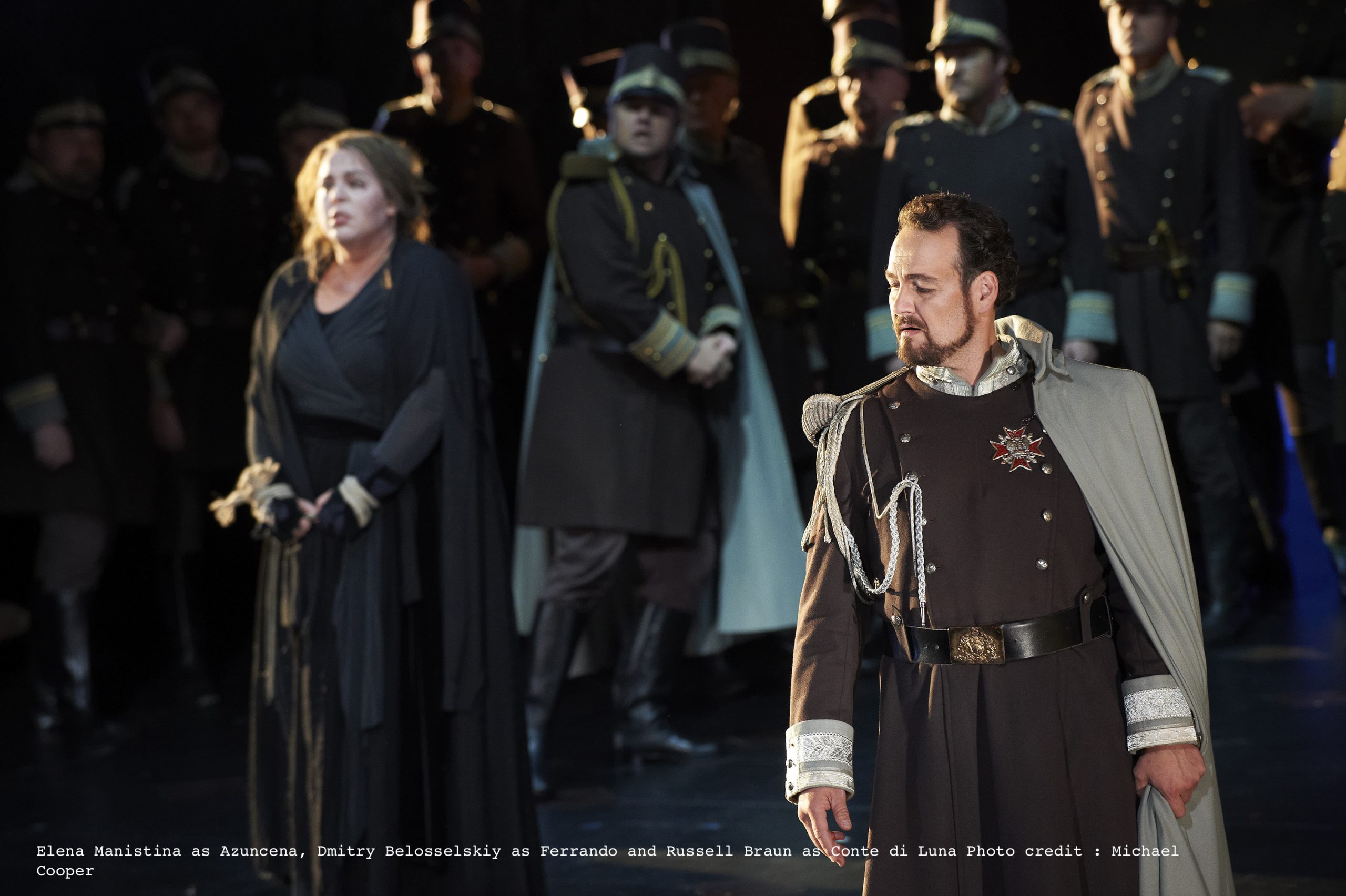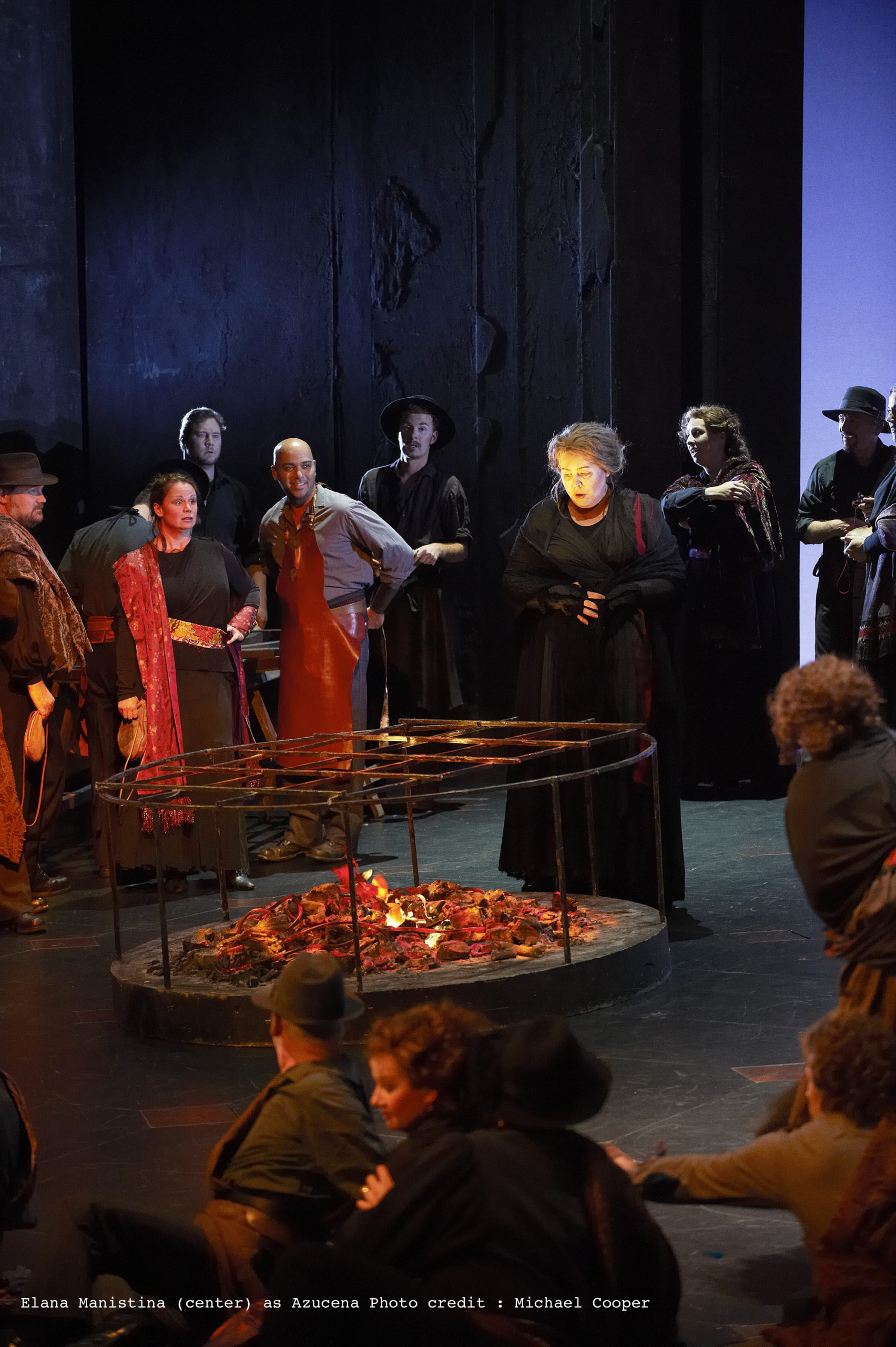 As Azucena, arguably Il Trovatore’s psychologically deepest, darkest character, mezzo Elena Manistina conveys an almost elemental force, brooding and troubled as a gathering storm. Throughout her many pivotal story-turning scenes, Manistina’s voice flashes like lightning, rumbles like thunder, whispers and weeps. Hers is a nuanced, multi-dimensional Azucena, a woman trapped in a waking nightmare, as complex, in her way, as Verdi’s arch antagonist, the dastardly Count di Luna. Canadian Russell Braun has the rich, undeniably high note-friendly baritone Verdi demands although his tonal palette seems, perhaps, a shade light for the troubled nobleman. This is certainly by no means to condemn his sound as disappointing or unfit for the role. His vocal instrument may lack the velvety warmth of a robust bass undertone but there is no denying its expressiveness. Braun’s ability to bridge from steely violent purpose to the tender beauty of di Luna’s heart-breaking aria, “Il balen del suo sorriso” (“The radiance of her smile”), is a thing of wonder.