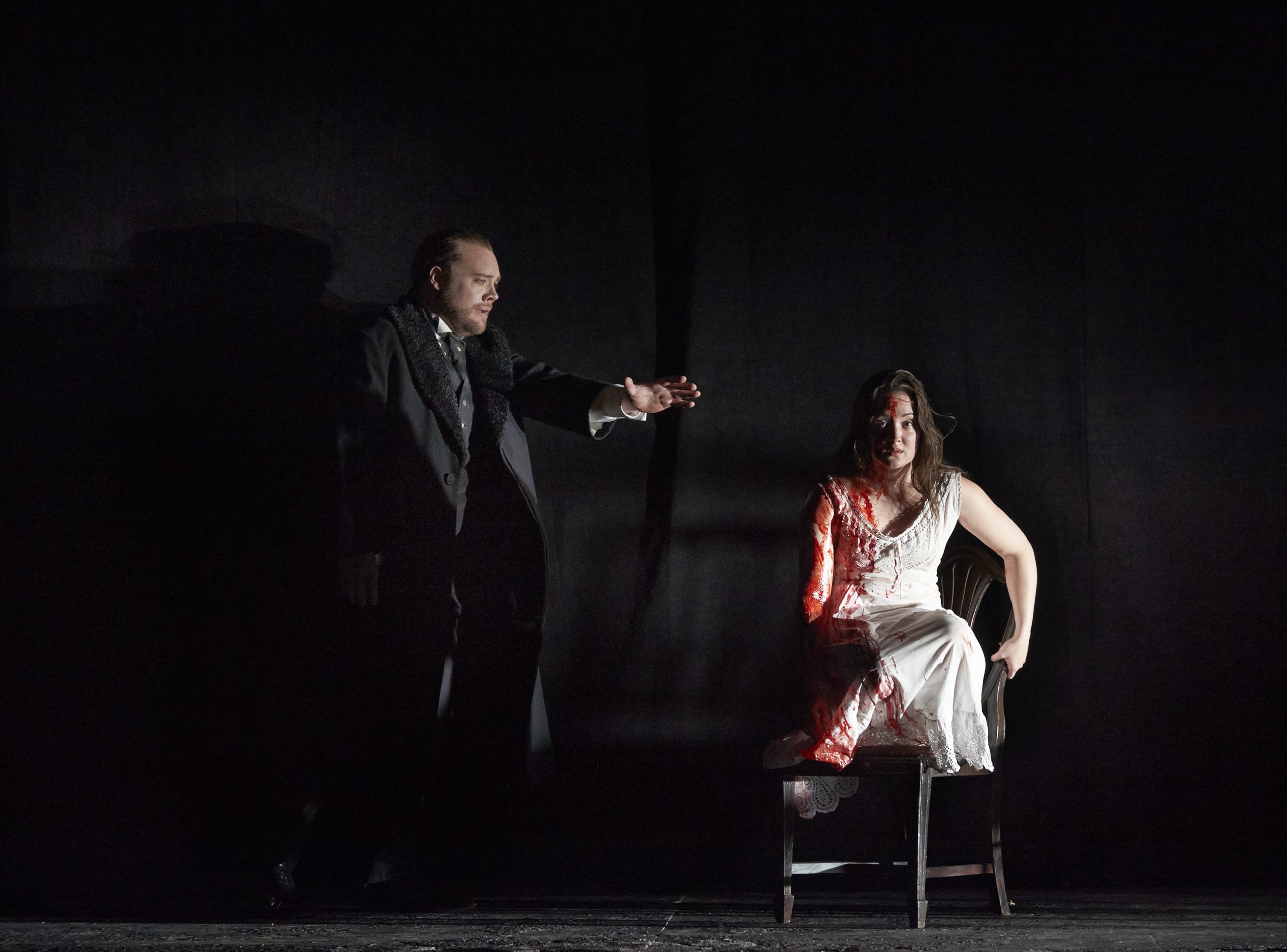 Later that night, Enrico challenges Edgardo to a duel. But there is menacing news afoot. Raimondo has word that Lucia has gone mad and stabbed Arturo to death in their marriage chamber. Lucia enters, bloody and deranged, convinced she is married to Edgardo. Enrico is overcome with remorse. But his mercy comes too late to save his sister. Alone at the agreed dueling place, Edgardo encounters Lucia’s passing funeral procession. Realizing her love has never faltered, Edgardo kills himself. An eerie calm settles over the ghastly events.
