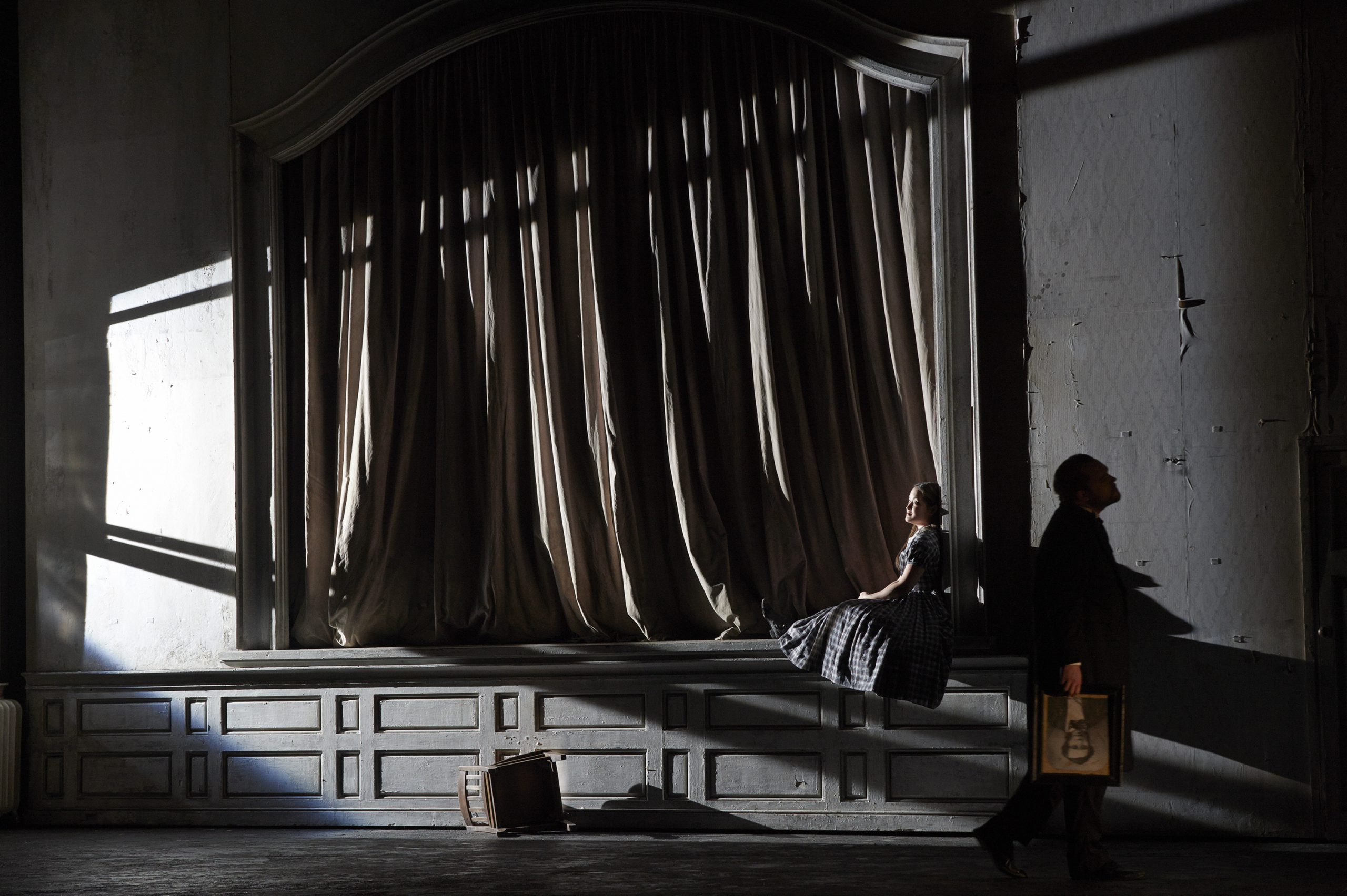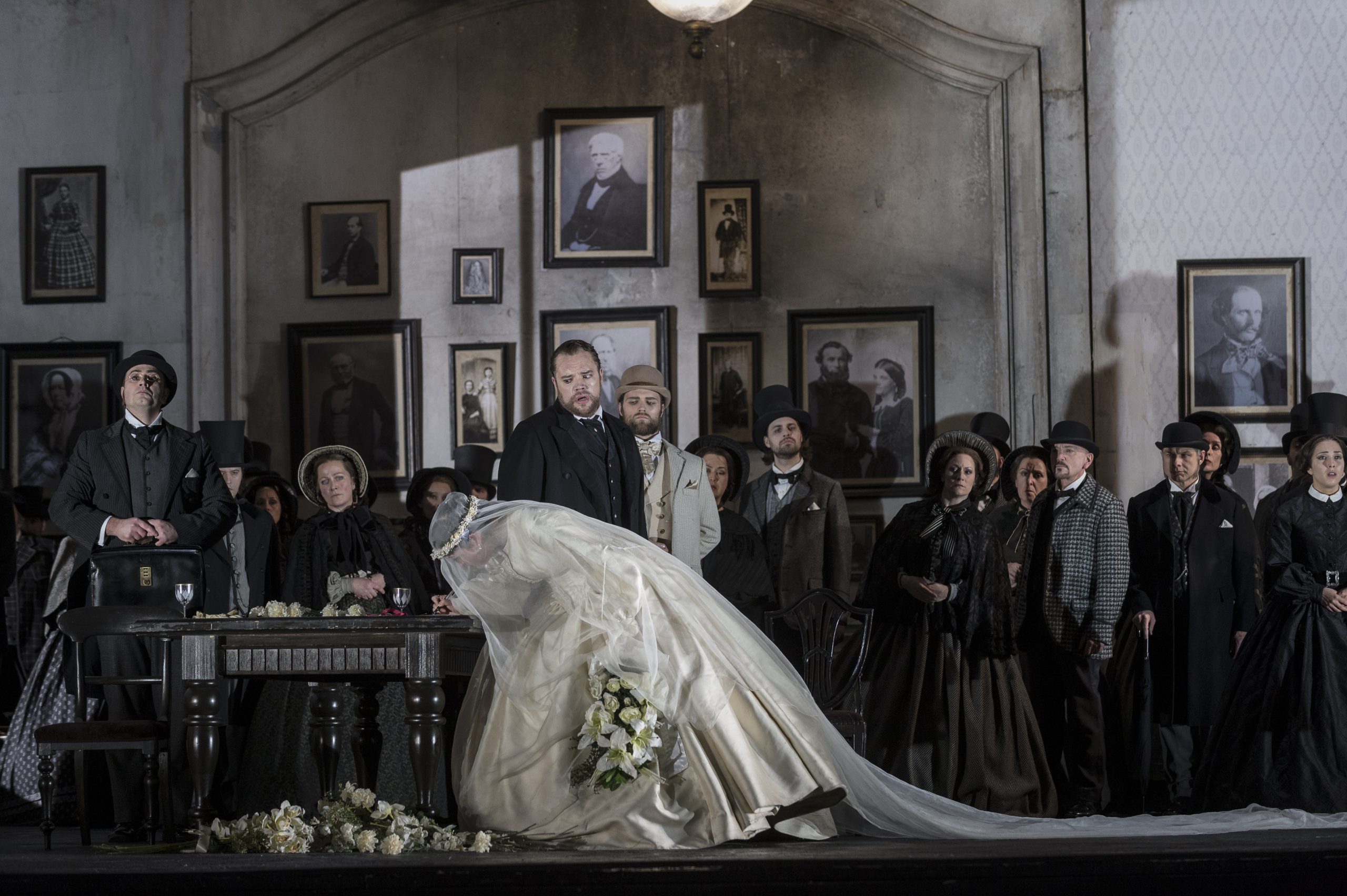 In the COC’s latest staging, director David Alden capitalizes on the work’s psychic rawness, setting his offering within the claustrophobic confines of a moldering Victorian Scottish country house. Everywhere cracked, peeling walls are hung with stiff unsmiling portraits, a ghostly gallery of nameless ancestors staring out from their frames with hollow, accusatory eyes. The age has shifted forward two hundred years from the time of Sir Walter Scott’s gothic tale. And the Highlands are even more spine-chilling than ever.
